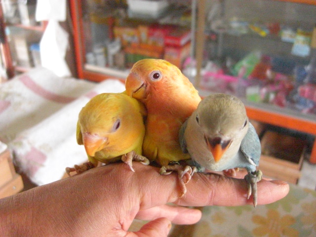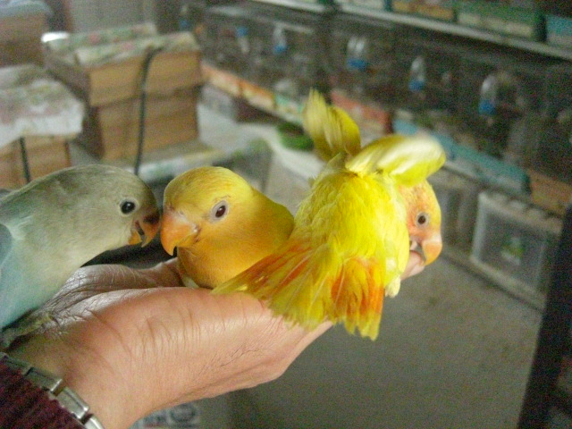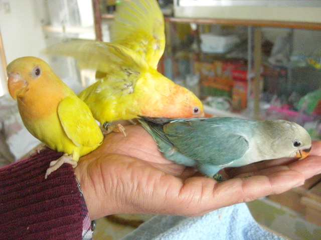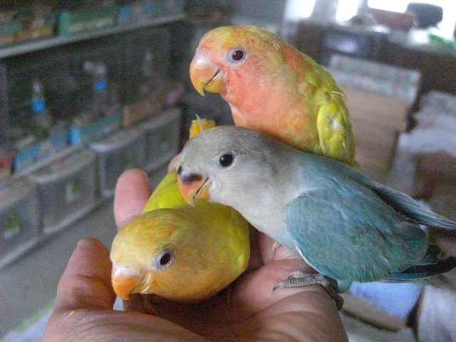 数日前からどうやら完全一人餌になりましたルチノーオパーリン2羽とWHコバルトオパーリン1羽です。3羽とも親鳥が異なります。まだ狭いプラケ内での生活でベタ馴れ状態ですが、これをケージに移してあまり手が届かなくなりますと馴れが損なわれてしまいますので迷っています。