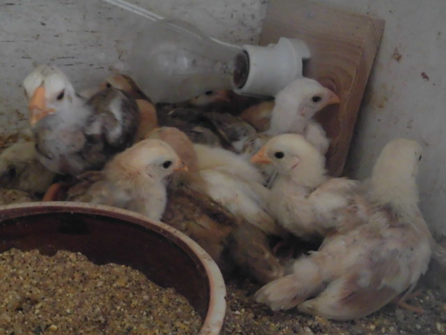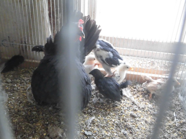 それでも、生後1ヶ月位は保温部屋での飼育です。写真の初め辺りは親鶏です。