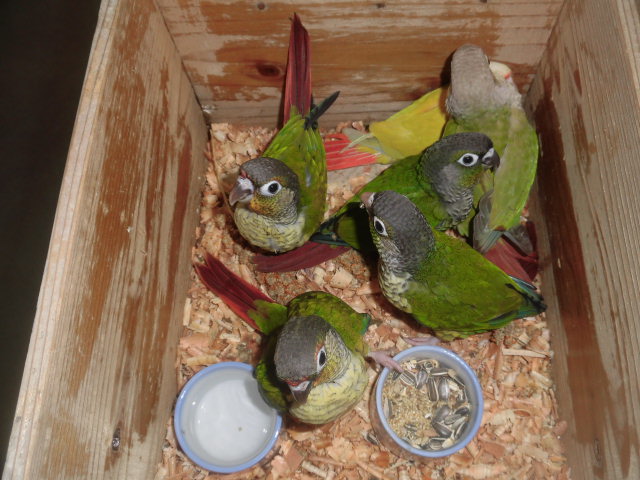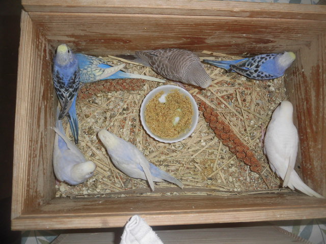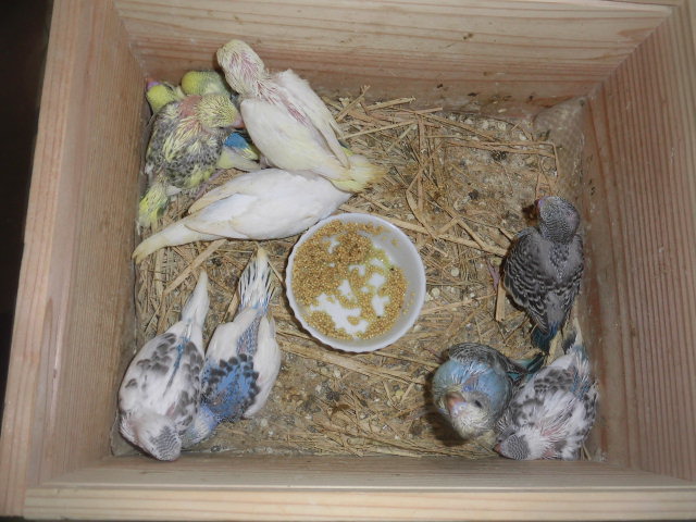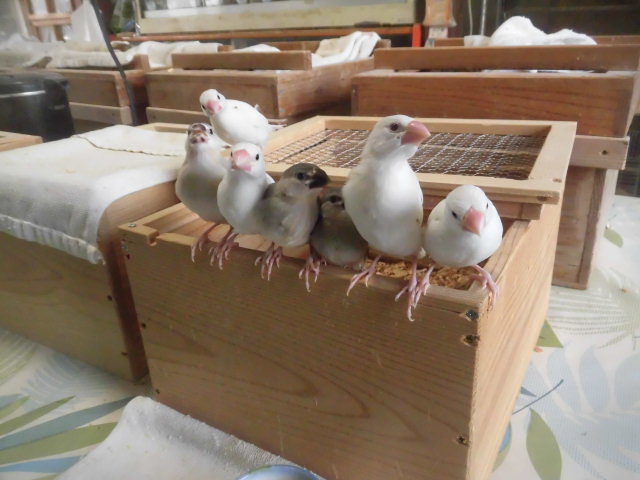 ウロコ2箱・オカメ2箱・そして今週お目見えのアキクサのローズ2羽(ブルー系)とサザナミが6羽です。